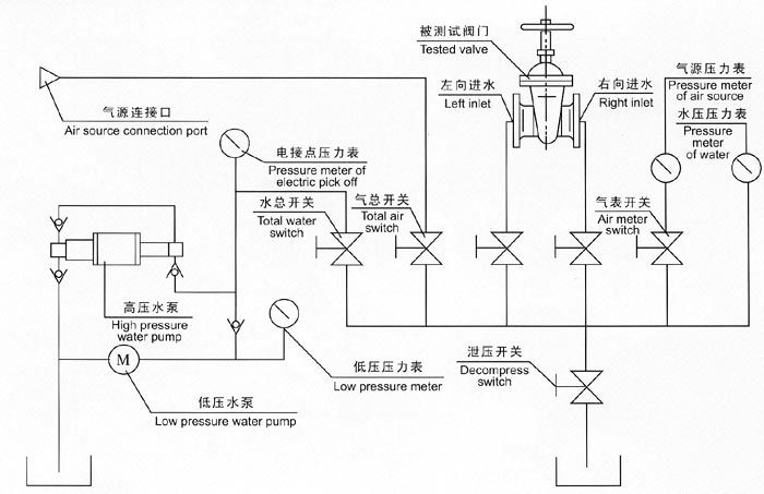六、液壓供壓水泵開(kāi)始工作前,先調(diào)節(jié)好電接點(diǎn)壓力表與被試驗(yàn)閥門(mén)壓力相同,然后進(jìn)行工作。