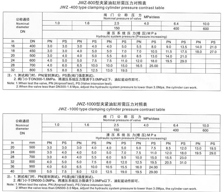 The test range of valve nominal diameter and nominal pressure for JWZ-1000 model