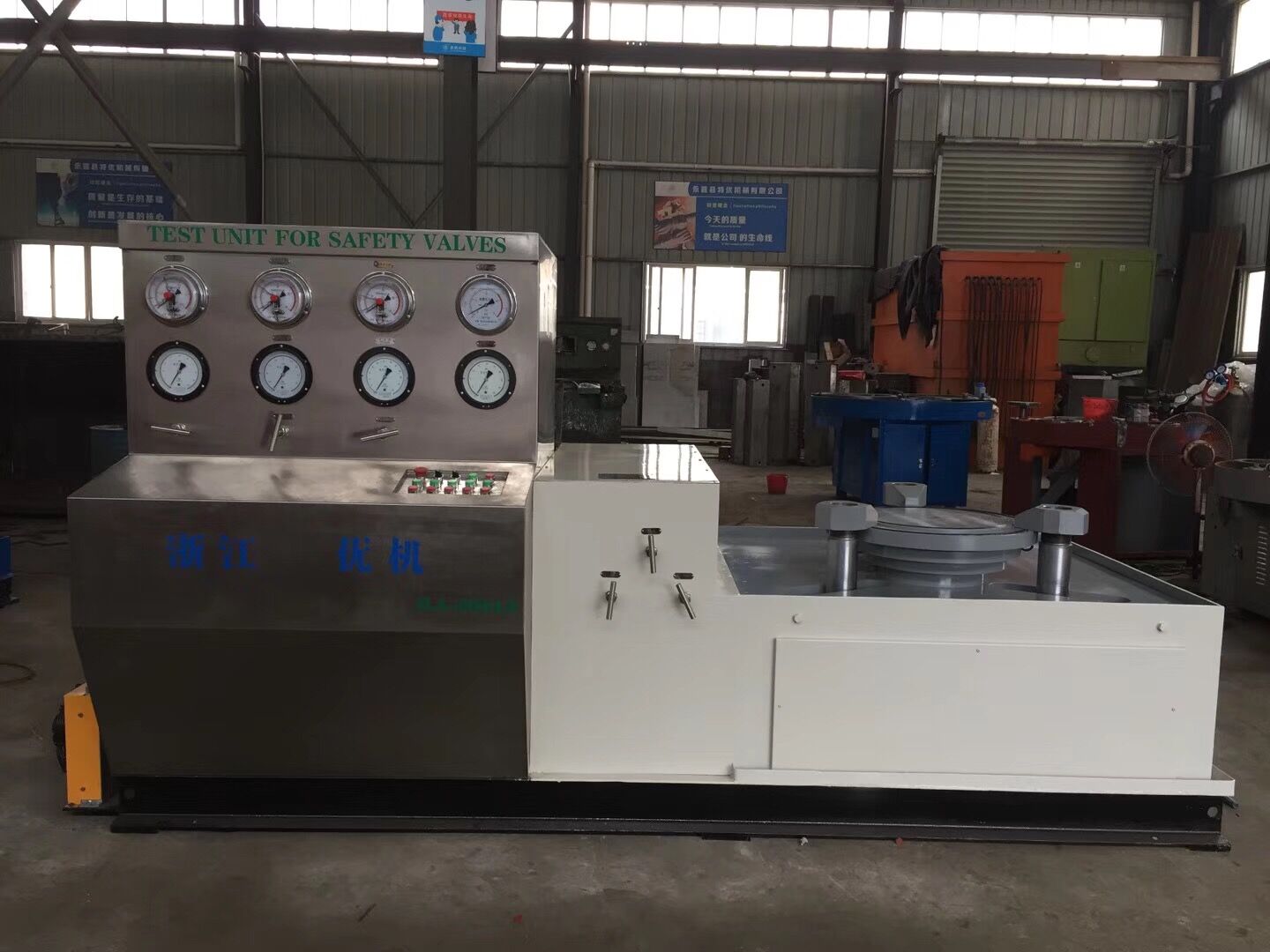 此次中標的產品是國家專利產品,公司擁有自主知識產權,專利號:ZL 2013 2 0894666.7,型號:JLA-Z-600精度智能安全閥測試機,該試驗設備精度可達到0.25%,分辨率0.01Mpa,過水部件和控制柜選用不銹鋼管路和高壓開關閥門,主要針對石化冶煉高要求大口徑安全閥。JLA-Z600試驗機具有結構簡潔、功能齊全、精度高、操作易懂等特點,主要測試檢驗安全閥起跳/整定/強度等性能參數檢測。是目前國內技術領先的智能安全閥試驗檢測設備,是浙江優機機械公司自主研發的新一代大口徑安全閥檢測設備,該產品先后中標大慶油田建設工程公司、中海油大亞灣閥門檢測中心,產品憑借高精度、智能、節能、操作方便等特點是石油化工和金屬冶煉企業的首選產品。